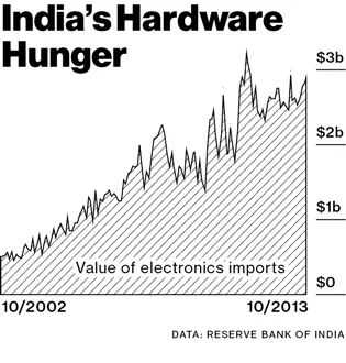 但在硬件方面,印度落后了。2013年,印度进口了价值335亿美元的电子产品,从半导体到智能手机。这比它在除石油和黄金之外的任何进口上花费的都要多。随着印度庞大且不断增长的中产阶级购买更多数字设备,对进口半导体和其他硬件的依赖可能会增加。根据市场分析公司Frost & Sullivan的预测,到明年,这类进口将超过420亿美元。“我们的制造业没有跟上我们的消费,”印度电子与半导体协会会长PVG Menon说。印度进行一些电视、手机、计算机和机顶盒的组装。