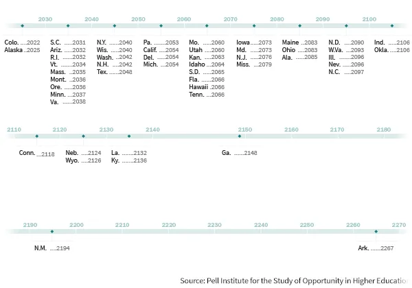 该报告还强调了来自佩尔高等教育机会研究所的 分析,显示如果自1980年以来的资金趋势持续下去,一些州可能在十年内完全停止支持高等教育。科罗拉多州可能是第一个,在2022年达到$0,随后是阿拉斯加两年后。在2030年代,另外九个州可能会加入,包括弗吉尼亚州、马萨诸塞州和俄勒冈州。以下是 高等教育纪事的图表 显示不同地方资金可能枯竭的时间表: