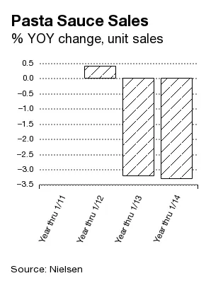 首先,美国意大利面酱市场在过去几年中放缓,尼尔森数据显示。过去两年销量下降,此前在2011年略有增长。截止1月18日的年度,美国意大利面和马里纳拉酱的零售销售额降至约17.8亿美元。