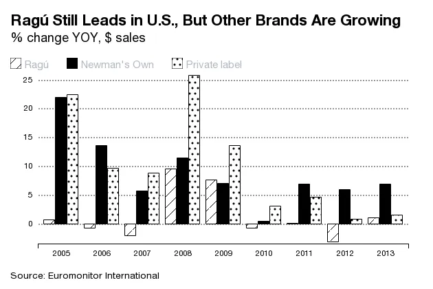 中价品牌如Ragú和第二名Prego面临着一个特定问题,即一方面受到低成本竞争者(如自有品牌)的挤压,另一方面则受到日益受欢迎的高端品牌的挤压,根据研究机构Euromonitor International的分析师Matt Hudak的说法。根据Euromonitor的数据,去年Ragú在美国市场占有27%的份额,而Prego占18%。与此同时,自有品牌在过去十年中几乎翻了一番,达到了意大利面酱市场的9%。