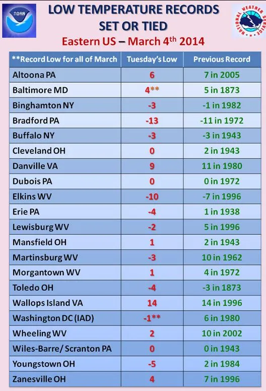 对于那些想要沉浸在这场冬季糟糕天气细节中的人,这里是周二创纪录的最低气温完整列表: