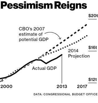 在2月28日,国会预算办公室修订了其在2007年对2017年潜在GDP的估计。新的估计比原始预测低7.3%。根据世纪基金会的研究员安德鲁·菲尔德豪斯的说法,这一向下修订抹去了1.5万亿美元的潜在产出。因此,国会预算办公室预测的潜在GDP接近19.2万亿美元,而不是接近20.7万亿美元。多年来,经济学家们对经济的期望过高。