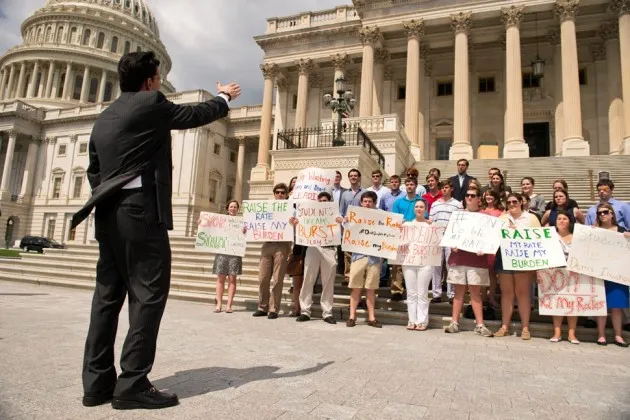 埃里克·坎托,弗吉尼亚州共和党,和在参议院台阶上抗议的实习生交谈,抗议学生贷款利率翻倍,时间是2013年6月28日摄影:汤姆·威廉姆斯/CQ Roll Call今天早上,伊丽莎白·沃伦参议员(马萨诸塞州民主党)启动 “高等教育不欠债”,这是一个新的进步团体联盟,旨在将对学生债务的广泛不满转变为一股完整的政治力量。“高等教育的成本并不像天气那样,是偶然发生的,” AFL-CIO的全国年轻工人协调员塔希尔·达基特说。“这实际上是政策决策的结果,我们可以让这些政策制定者负责。”