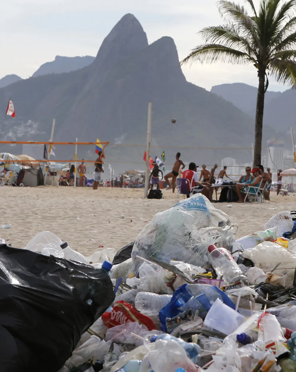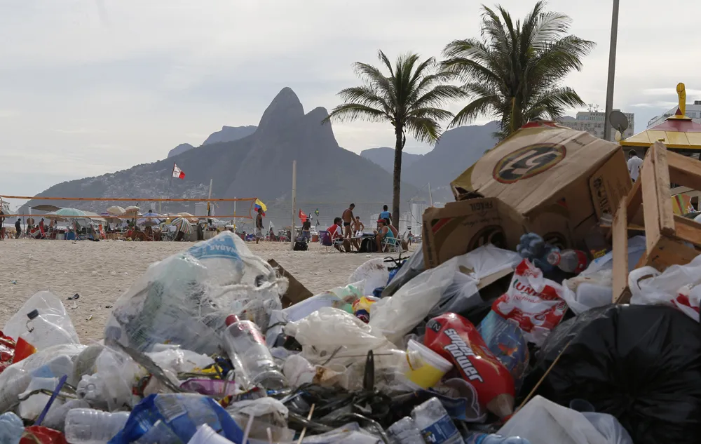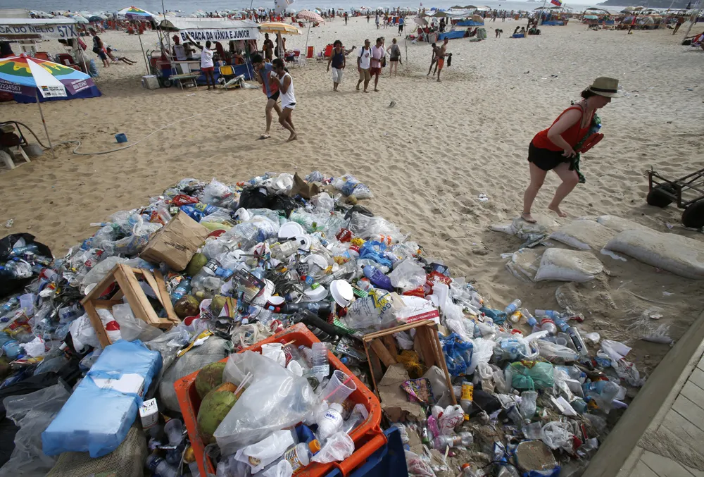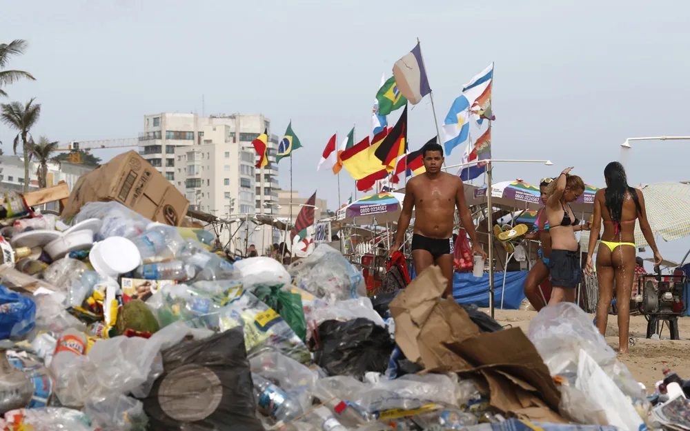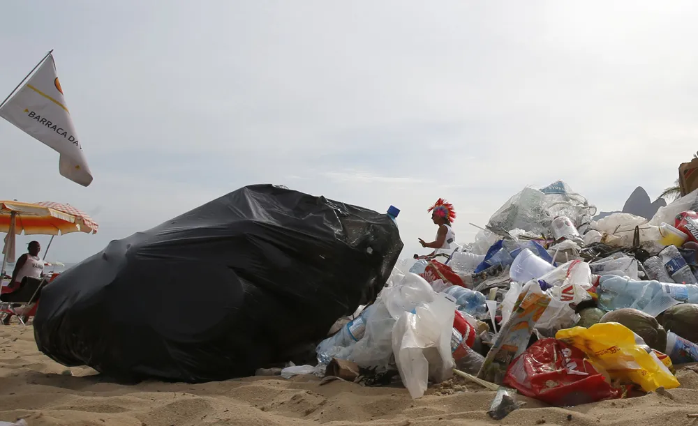 2014年3月5日,里约热内卢伊帕内玛海滩上可见垃圾。路透社/塞尔吉奥·莫拉斯顶部图片:2014年3月5日,居民在里约热内卢伊帕内玛海滩附近走过一个装满垃圾的垃圾桶。(路透社/塞尔吉奥·莫拉斯)
