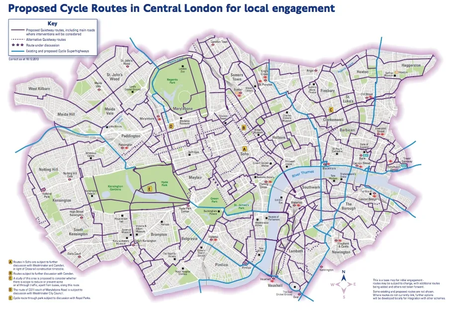 车道的创建者也在考虑自行车与其他交通的互动。为了减少城市汽车在一个个交叉口之间行驶时发出的刺耳尖叫声和冲击感,交通信号灯将减少,取而代之的是高架的减速带人行横道(可能配有 贝利沙灯),这被认为能更好地减缓汽车速度,同时保持街道的畅通。尚未最终确定的 临时、不完善的地图(如下所示)仅显示了伦敦市中心的车道规划,表明即使没有完全隔离的车道,这里也在努力追求目标。像这样的直观、逐步改进正是使城市骑行变得可行的因素。
