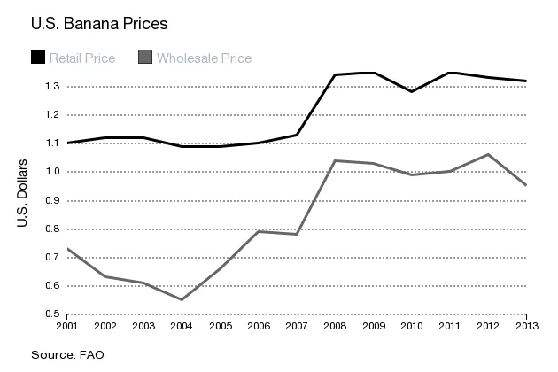 根据联合国粮食及农业组织的数据,美国的零售香蕉价格近年来基本保持稳定。这部分是因为超市不想动摇这种受欢迎产品的价格,以保持顾客的回头率。联合国组织在一份 报告(PDF)中解释说,美国人吃的香蕉比任何其他新鲜水果都多,而超市则“将因批发价格上涨而造成的暂时损失分摊到他们销售的其他产品上,同时保持香蕉的价格对消费者来说较低。”