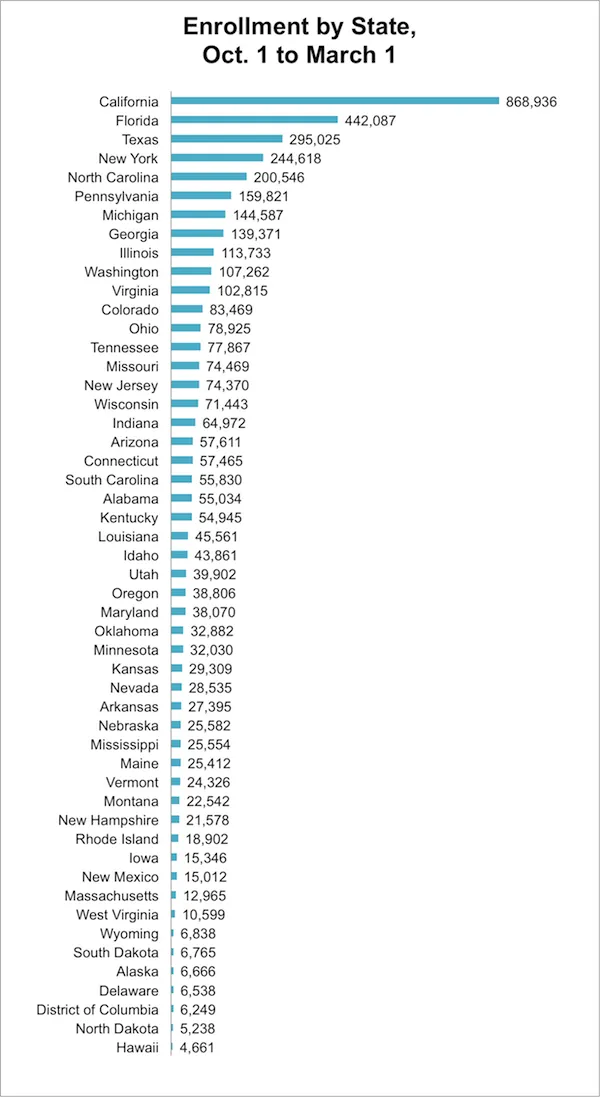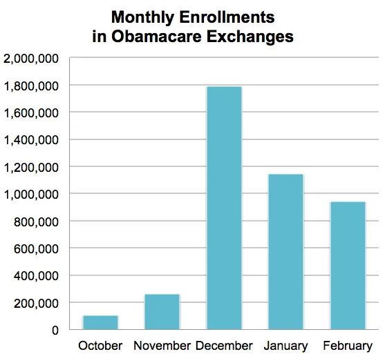 大约943,000人通过healthcare.gov和州交易所获得了健康计划,人数少于1月或12月,但足以将总注册人数推高至420万(PDF)至今。