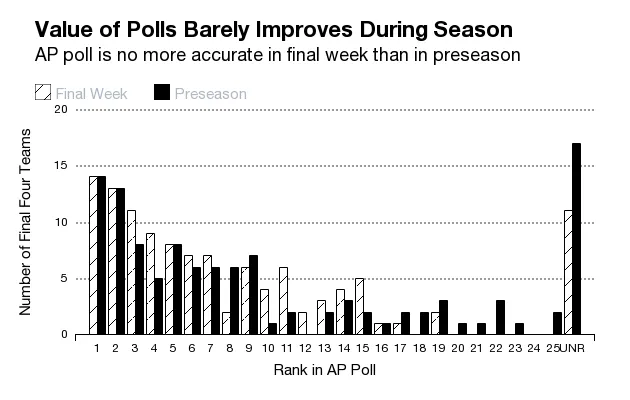 这些投票可能很有趣,让球迷感受到谁在上升或下降,但它们对预测并没有太大帮助。在许多年里,赛季前的投票在预测最终四强方面比赛季最后一周的投票更准确。这表明,投票者往往在年初就判断正确,依赖于对人才水平的粗略感觉,而不是大量实际比赛结果。即使任何给定的球队在赛季中输掉比赛,到了三月排名下降,也许内在的天赋在锦标赛中重新显现,并帮助推动一波胜利。