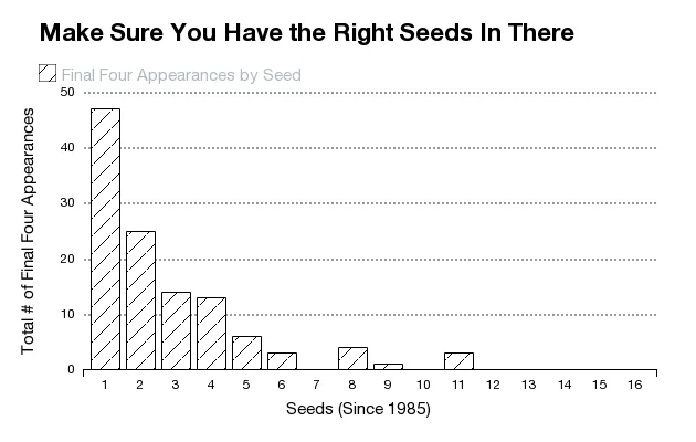 根据历史数据,您最低风险的最终四强阵容应包括两个第一种子,一个第二种子,以及一个来自3到5范围的球队。专注于寻找这样的球队。这可能比陷入逐轮对决更容易,因为逐轮对决可能会使您的整个预测偏离方向。任何超出这个范围的选择都会让您进入危险区。过多的高种子几乎和完全不选它们一样危险。强队是获胜预测的支柱,稍微低一些的种子则是点缀。不到10%的最终四强球队的种子是第六或更低。