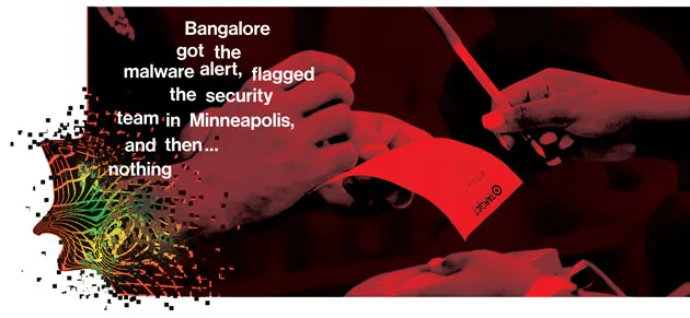 在11月30日星期六,黑客们设置好了陷阱,只需做一件事就可以开始攻击:规划数据的逃逸路线。当他们上传外泄恶意软件以移动被盗的信用卡号码——首先到分散在美国的中转点以掩盖他们的踪迹,然后进入他们在俄罗斯的计算机时——FireEye发现了他们。班加罗尔收到了警报,并标记了明尼阿波利斯的安全团队。然后…… 什么也没发生。