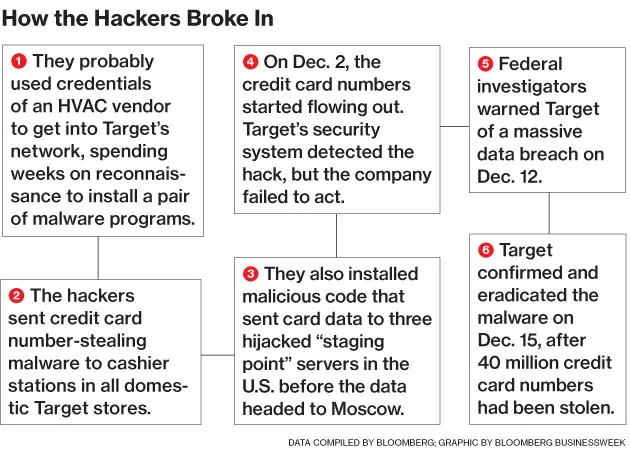 美国历史上最大的零售黑客事件并不是特别有创意,也似乎注定不会成功。在2013年感恩节前的几天里,有人向 Target 的安全和支付系统中安装了恶意软件,旨在窃取在该公司1797家美国商店使用的每一张信用卡。在关键时刻——当圣诞礼物被扫描并装袋,收银员要求刷卡时——恶意软件会介入,捕获购物者的信用卡号码,并将其存储在被黑客控制的Target服务器上。