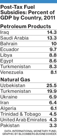 国际货币基金组织(IMF)估计,2011年全球对石油产品、电力、天然气和煤炭的政府支持达1.9万亿美元,占全球GDP的2.5%。这个数字包括了补贴燃料对公共健康、环境和基础设施造成的损害成本;扣除这些成本后,各国每年仍需支付4800亿美元的补贴,占全球GDP的0.7%。这些支出主要集中在中东、亚洲、中欧以及前苏联国家。全球对天然气补贴最重的国家是乌兹别克斯坦,占GDP的26%。委内瑞拉国内石油价格的支持率约为8%,伊拉克为14%。美国是发达国家中仅次于卢森堡的最大补贴国,支持汽油和柴油的比例为2%。