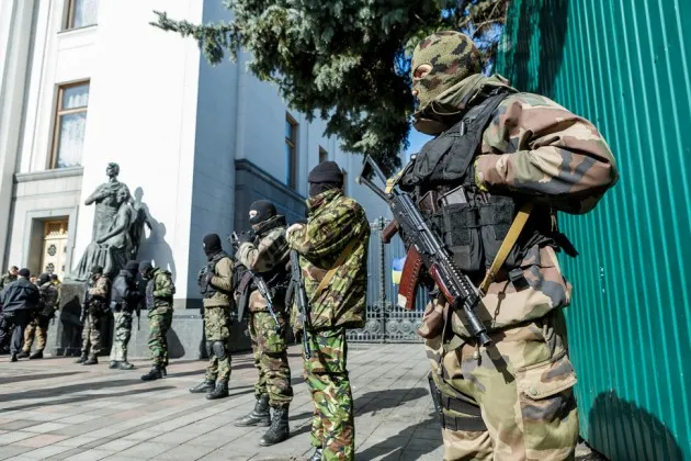 一排15名男子前来保护议会的程序,防止挑衅者。15人都携带他们声称为狩猎目的购买的自动武器。指挥官安东·普里穆什卡表示,他们大约有700人,如果俄罗斯继续侵入乌克兰,他们可以在24小时内动员1.1万人前往乌克兰东南部。