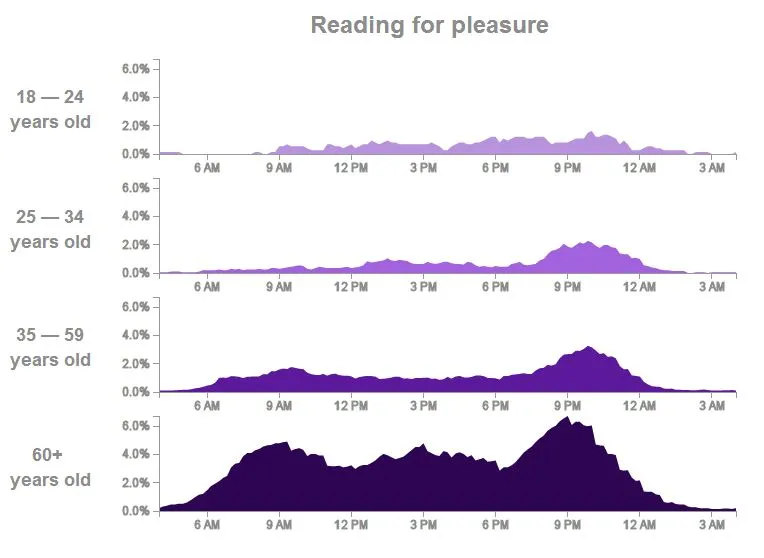 老年人也非常喜欢拿起一本书带到床上。如今的孩子们则显示出更少的阅读乐趣的迹象: