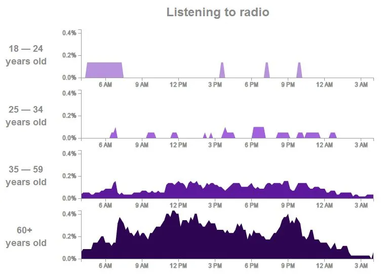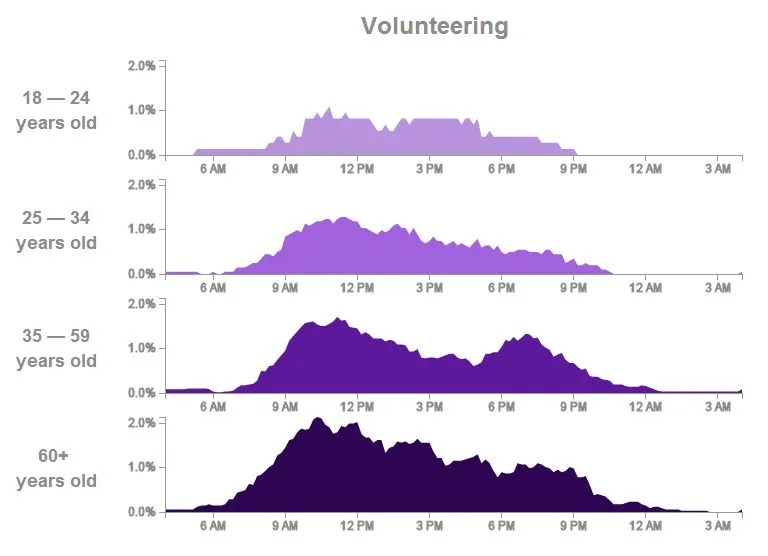 最有趣的差异来自于比较最老和最年轻的群体,关键的对比体现在像宗教活动、志愿服务、休闲阅读和听广播等活动上。我也对我们在生活过程中变化的程度感到着迷。如果你就是你所做的事情,那么在你的一生中,你会承担许多不同的身份。另一方面,我想展示日常节奏中的相似性,基本的连续性在哪里。有趣的是,在某些维度上,我们的日子看起来是多么相似,比如看电视、吃饭和社交。