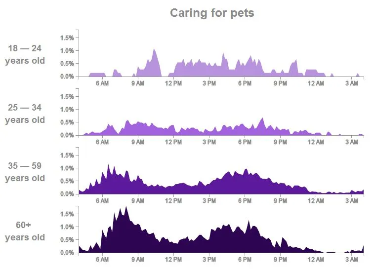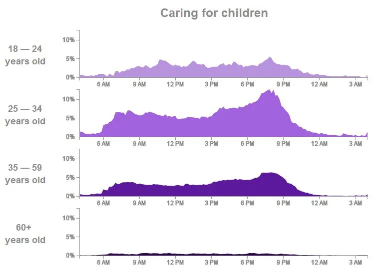 以下是沃克项目的选摘;在他的 网站上找到完整的互动版本。首先,这里有证据表明,20多岁和30岁出头的父母花费的时间远远超过其他群体来照顾孩子;大部分照顾发生在晚上。“这个年龄段的家庭中最有可能有非常小的孩子,”沃克写道:
