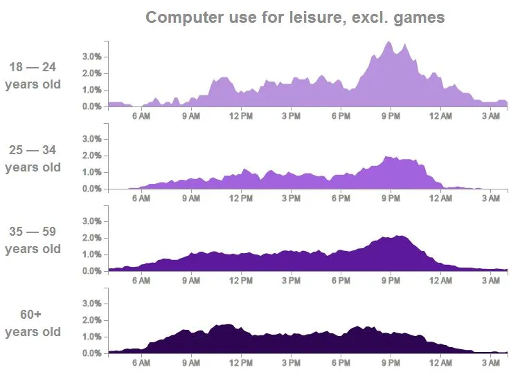 对于老年人来说,平均一天是一个放松的巨大机会:75岁及以上的人几乎花8小时参与某种休闲活动。这几乎是所谓的千禧一代所享受的时间的两倍。但嘿,在他们这个年龄,我们中最年长的人有权享受生活。