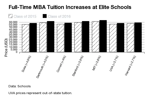 拥有最具选择性的MBA项目的学校可能会更大胆地提高价格,因为他们的客户群体。“MBA候选人对价格的敏感度不高。当涉及到教育的价值和潜在的职业利益时,他们不会对每年64,000美元与58,000美元之间的差异感到惊讶,”Quacquarelli说。“真正引人注目的是全额和部分奖学金。”