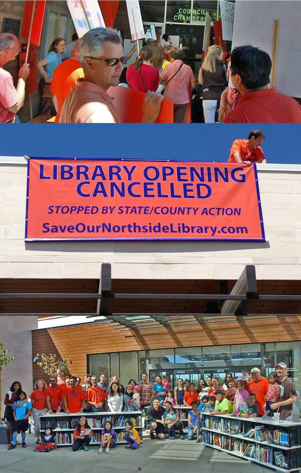 自去年夏天以来,图书馆基金会与一长串城市、县和州的代表会面,以争取对项目完成的支持。它在图书馆和市政厅前组织了集会,吸引了超过1300人参加。九月份,社区还在北侧入口设立了一个“牛奶箱图书馆”,这个临时解决方案里装满了从图书销售中剩下的书籍和居民捐赠的书籍,现在似乎已成为一个永久的设施。