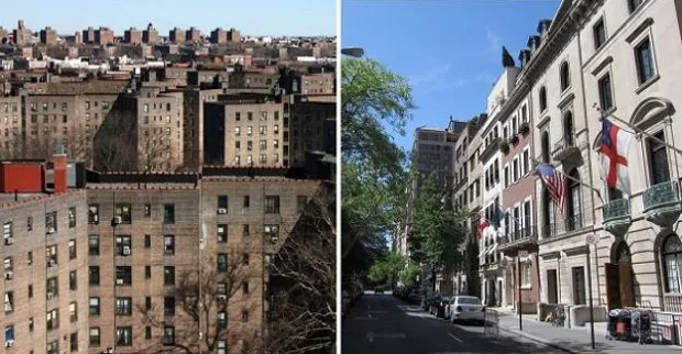 顶部图片:皇后桥公寓,美国最大的公共住房开发项目(左),以及曼哈顿上东区的一条富裕街道(右)(维基共享资源用户Wikiwiki718和 Gryffindor)。