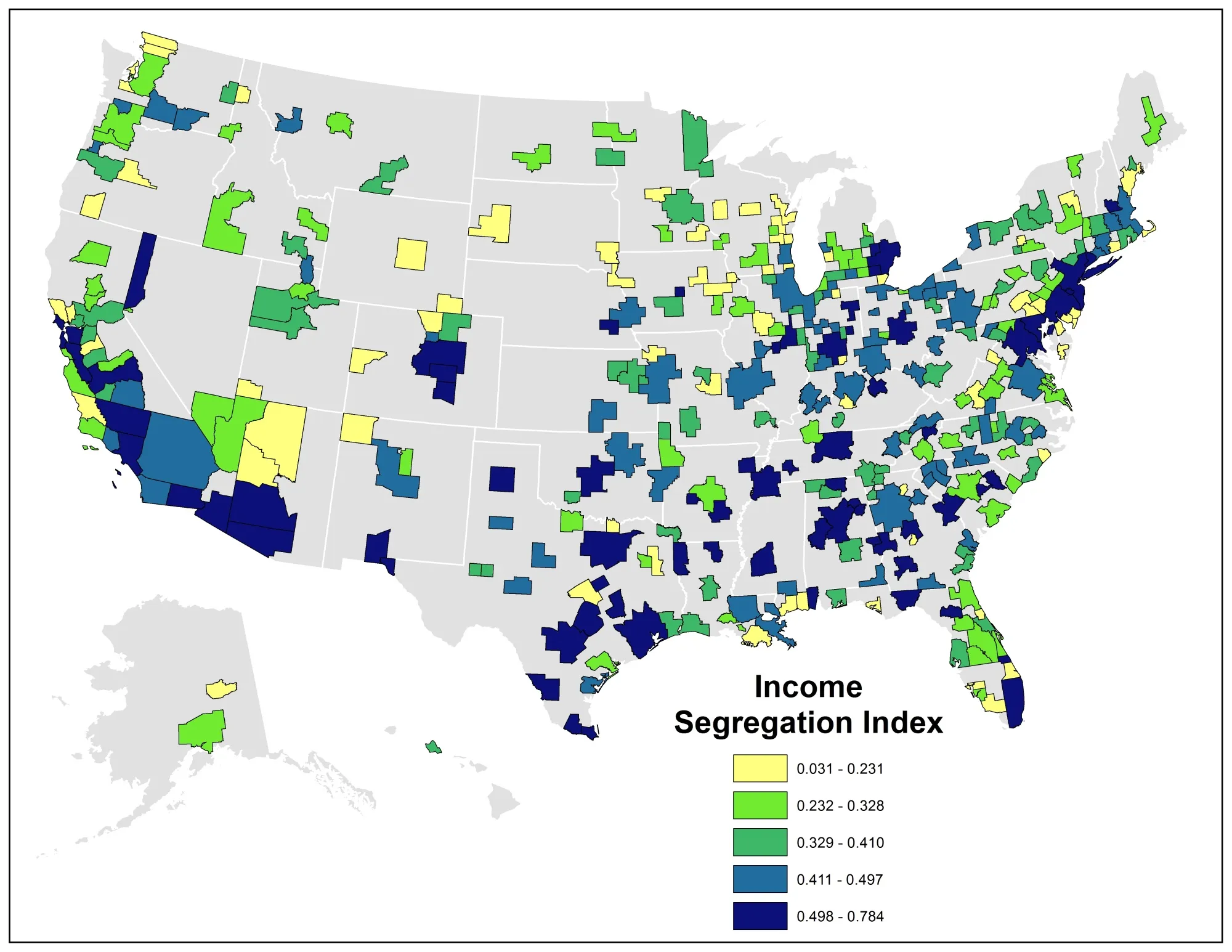 正如地图清楚显示的那样,波士顿-纽约走廊、大迈阿密、北加州和南加州、从阳光带到德克萨斯州,以及主要中西部城市的收入隔离水平很高。