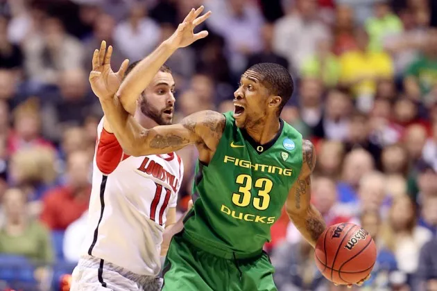 俄勒冈鸭队的卡洛斯·埃莫里在2013年3月29日印第安纳波利斯举行的2013年NCAA男子篮球锦标赛半决赛中,在路易斯维尔红雀队的卢克·汉考克的防守下寻求传球摄影:安迪·莱昂斯/盖蒂图片社在大学篮球这个大生意中,有一个问题至关重要:耐克会再失手吗?