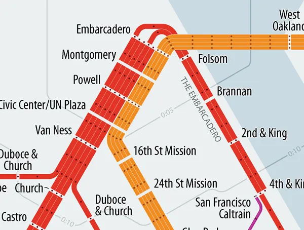 为了制作他的地图,邓恩查看了BART、Muni和Caltrain的时刻表,这三个火车系统连接旧金山、硅谷和东湾。每个系统都有自己的线路和颜色(这意味着可以换乘的车站会出现多次)。