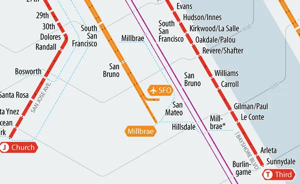 以位于郊区的米尔布雷站为例,它在下面的地图中出现了三次。从Embarcadero到米尔布雷的BART线路大约需要35分钟,标记为橙色,地方Caltrain的时间大致相同(不包括换乘时间)。但是,Caltrain的快速列车Baby Bullet在这16英里上快了十分钟。而且,作为比较,沿着地方MUNI系统行驶35分钟只能到达市区Bayview社区的Le Conte站,距离不到一半。