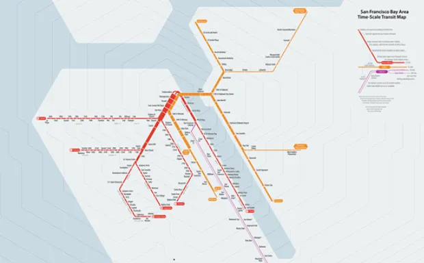 邓恩的 最新作品,今天通过 Kickstarter 开始预售,基于一个有用但 deceptively 难以呈现的指标绘制了湾区的公共交通系统:到市中心所需的时间。