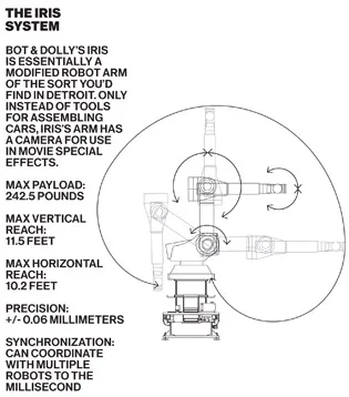 为了实现导演阿方索·卡隆所设想的——但他说“无法做到”——Bot & Dolly 翻转了典型的好莱坞方法。失重效果通常是通过让演员在音效棚中飞行并在后期添加计算机图形来实现的。在 重力 的情况下,卡隆和视觉特效公司 Framestore 动画化了整部影片的 3D 数字分镜头,这种技术称为预可视化,在与演员的实拍开始之前就完成了。因此,实拍必须完美匹配预先存在的数字编舞。在旧金山进行了一些测试后,Bot & Dolly 将其 3000 磅重的机器人装载到货运飞机上,前往卡隆在伦敦的片场。一到那里,这些机器就成为音效棚中复杂舞蹈的一部分。一个安装在机器人的相机以与计算机生成的宇宙飞船内部或飞向地球的宇航服的粗略序列相匹配的方式围绕桑德拉·布洛克移动。焦点完全放在演员的脸上,因为影片的其余部分完全是在计算机内部创建的。一旦实拍镜头完成,这些镜头就与计算机图形数字结合在一起。“与其让演员在一个世界中移动,不如说我们的机器人移动了相机、布景和灯光,”金布鲁说。根据 Bot & Dolly 高级制作人比尔·加卢沙的说法,这个过程部分受到经典电影 皇家婚礼 中弗雷德·阿斯泰尔在墙壁和天花板上跳舞的场景的启发。