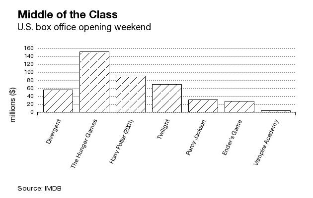 该电影在美国影院的票房估计为5600万美元——如果稍微低于预期,这仍然是一个可观的数字。在年轻成人电影的世界里,这个成绩是B或B-。班级的顶端属于第一部*《饥饿游戏》,其2012年首映时的票房为1.52亿美元,排名其次的是开创性的哈利·波特电影(2001年首映9000万美元),以及第一部《暮光之城》*(2008年6900万美元)。