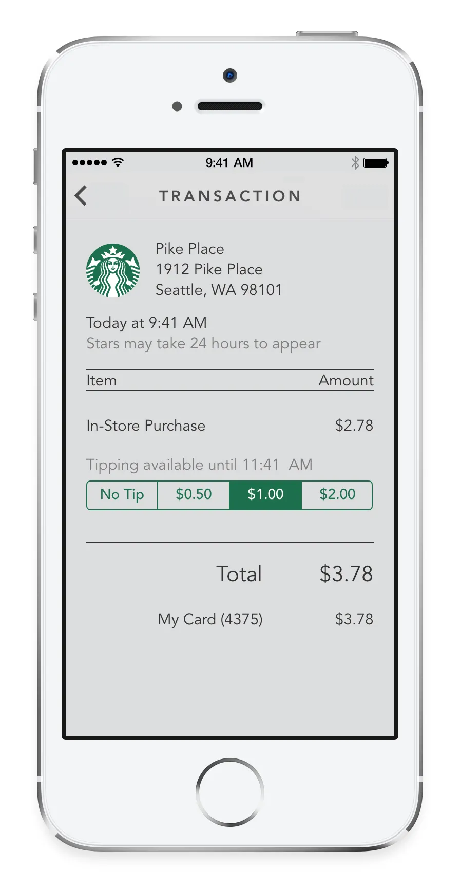 本月早些时候,星巴克 添加了小费功能到其移动支付系统。通过公司iOS应用支付饮品的顾客现在可以在同一交易界面上给他们的咖啡师小费(该功能将在今年晚些时候推出Android版本)。如下面所示,您可以选择在支付后最多两小时内留下$0.50、$1或$2的小费。