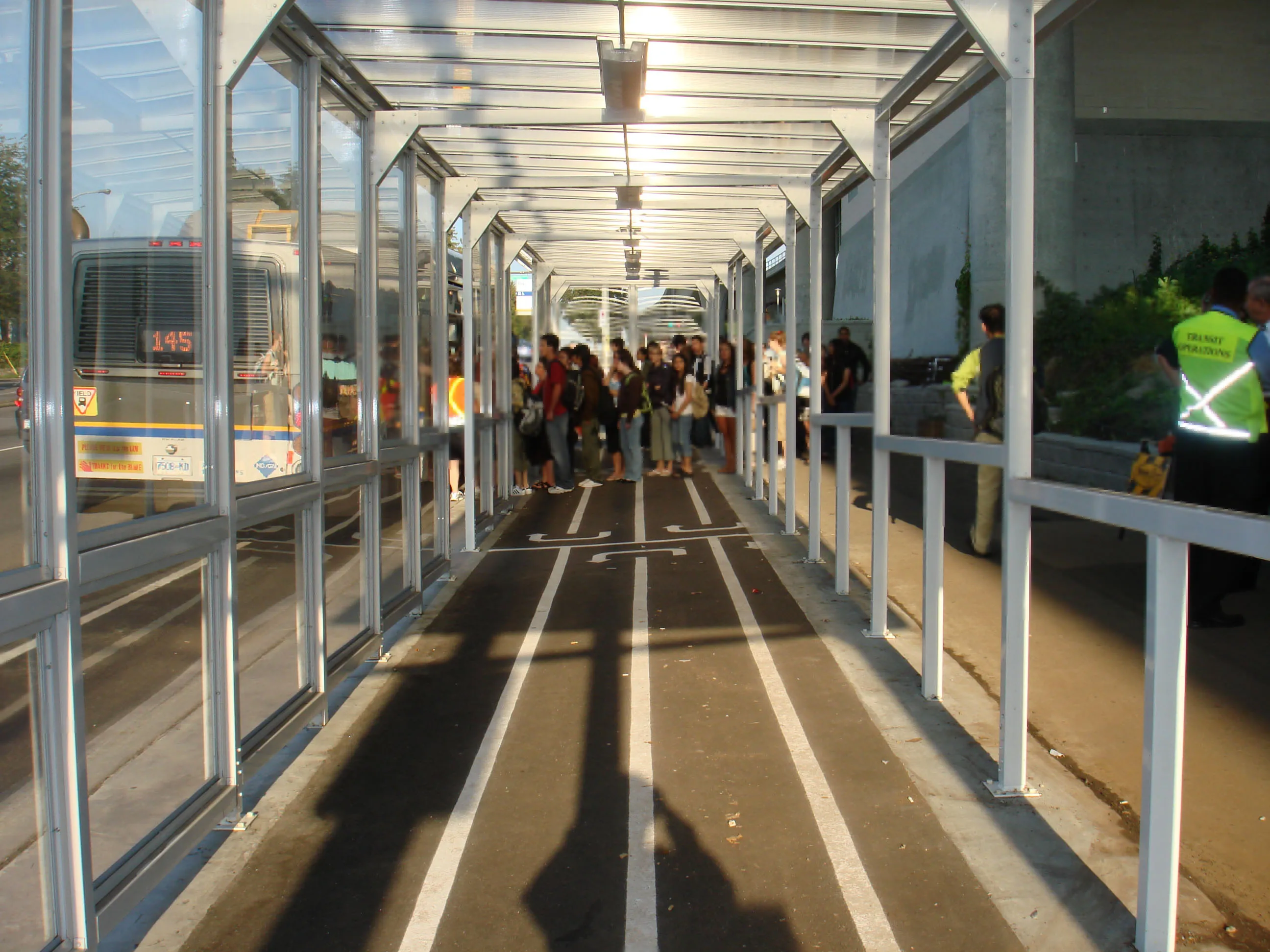 这 西行视频,在同一个早晨拍摄,展示了让乘客形成折返队伍以便后门的尝试。折返队伍通过将队伍折回延长队列(想想:机场安检);在这种情况下,他们可以增加大约十名乘客的队伍容量。垂直支柱完成了这个任务,尤其是在地面箭头的帮助下,指示第一人该站在哪里,但乘客仅凭人行道胶带的引导并未遵守折返队伍。