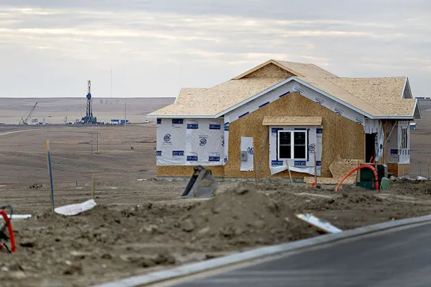 在北达科他州威利斯顿,一座正在建设的单户住宅远处的原油钻井平台摄影:丹尼尔·阿克尔/彭博社欢迎来到21世纪的美国,在这里,人口增长趋势受到婴儿潮一代涌入佛罗里达退休社区和工人追逐从北达科他到德克萨斯的水力压裂繁荣的驱动。