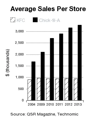 虽然Chick-fil-A的门店数量较少,但在客流量上弥补了这一不足。每家餐厅在2013年的收入约为320万美元,超过了平均KFC的93.8万美元的三倍多。过去十年,KFC餐厅的平均销售额基本保持不变,而Chick-fil-A的销售额则稳步上升。去年,Chick-fil-A的同店销售额增长超过3.6%;而KFC则下降了2%。