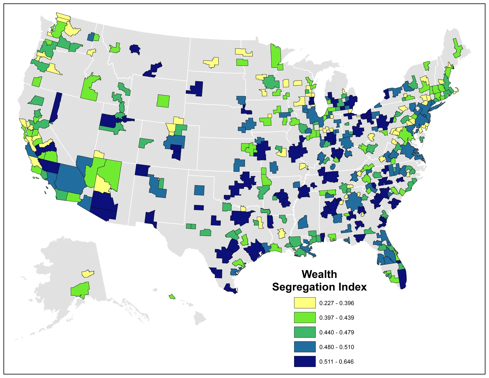 下面的地图显示了美国大都市中富裕家庭的隔离情况。深蓝色反映了富裕人群最为孤立的大都市;浅蓝色表示他们相对孤立;绿色表示他们与其他人口群体适度隔离;黄色则显示富裕人群与其他人口群体更为混合或融合的大都市。