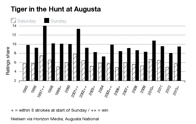 最佳收视率的两年,1997年和2001年,是伍兹第一次赢得该赛事的两年。第三好的年份是2010年,那是他在2009年秋季因婚外情丑闻而首次参赛的年份。他那年获得第四名,并在最后一天落后领先者四杆。通常情况下,当伍兹在前三轮结束时仍有竞争力时,收视率会提高。