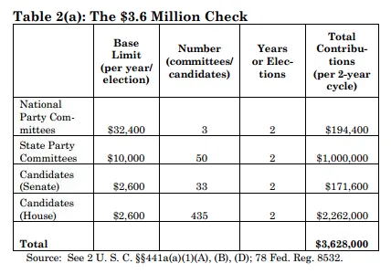 布雷耶列举了三种不同的场景来说明这将如何运作。“没有总限额,法律将允许一个富有的个人在两年的选举周期内开出360万美元的支票——全部用于支持他的政党及其候选人。”他说,法律允许一个政党及其候选人以一种方式设立他们的委员会,从而“将大部分富有捐赠者的贡献转移到一个候选人身上。”在附录中,布雷耶提供了一张表格,展示了这将如何展开: