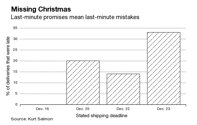 以过去的假日季节为例。根据 一项新的研究,只有大约三分之二的零售商勇敢或自信地承诺在12月23日午夜之前的订单能在圣诞节前送达,最终这些包裹按时送达的比例并不高。大多数零售商给出了更保守的指导方针,将12月25日的送达截止日期提前了一周到五天。但这一群体的可靠性也不高,成功率仅为80%。