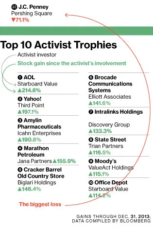 一些激进的运动对股东造成了伤害。在阿克曼对J.C. Penney的投资后,股票在12月前下跌了71.1%,因为公司改变了战略,销售额暴跌。科尔维克管理公司的基思·迈斯特和亿万富翁投资者乔治·索罗斯在2012年底敦促ADT,最大的家庭安全系统提供商,使用借款回购股票。ADT最终在11月回购了科尔维克持有的股份,两个月后,由于收益令人失望,股票暴跌。自从迈斯特被支付离开以来,股东们损失了约30%。