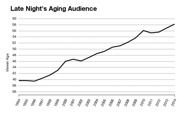 就像高尔夫和职业棒球一样,传统的深夜脱口秀也面临着老年观众的问题。观看大卫·莱特曼秀的观众,基本上是1982年节目刚推出时与主持人一起的同一群体,缺乏年轻观众的参与。根据Horizon Media的数据,莱特曼观众的平均年龄在过去一年跃升至58.2岁,而十年前为48.5岁。这与吉米·基梅尔直播秀的54.3岁和吉米·法伦的今夜秀的57.1岁相比,后者在宣布老牌主持人杰伊·雷诺将离开后,观众年龄略有下降。
