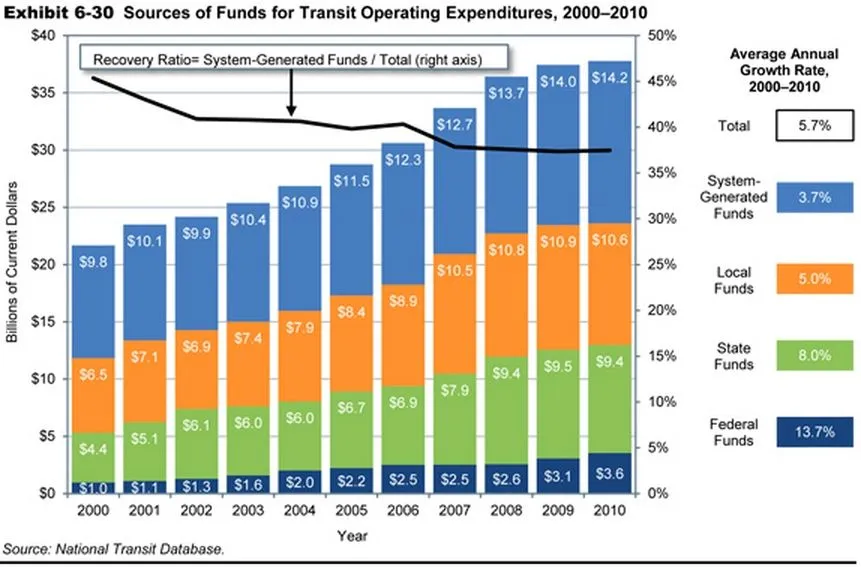 从美国所有交通系统的整体来看,我们看到在过去十年中,尽管交通运营的资金有所增加,但这一恢复比例却呈下降趋势。系统生成资金的份额——主要是票价,虽然也可以包括平台和车内广告等——自2000年以来增加了近4%。与此同时,联邦和州资金的份额分别增加了8%和大约14%。来自交通部的报告: