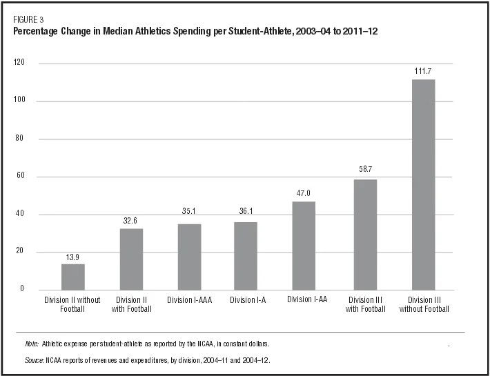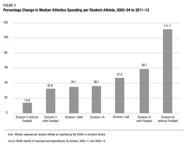 你可能会惊讶于哪些学校在体育支出方面处于领先地位。根据柯蒂斯和桑顿的说法,一级学校(竞争水平最高并允许最多奖学金的学校)每位学生的中位数支出从2003-04到2011-12增加了47%。而没有足球队的三级学校的中位数体育支出则激增了112%,这被视为“提高入学率的一种机制”。