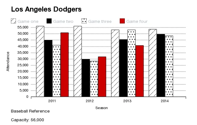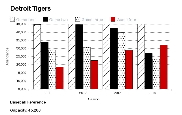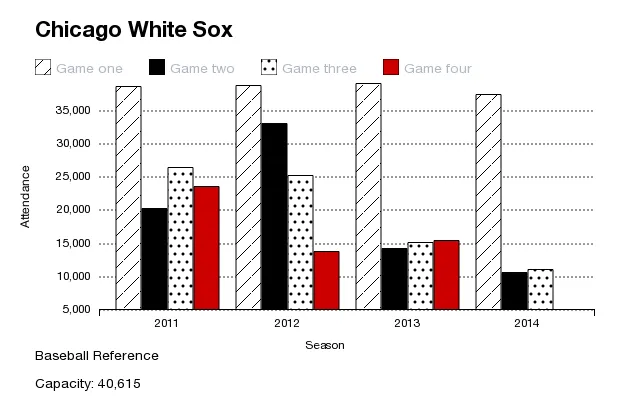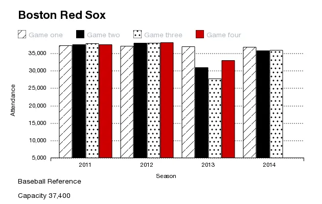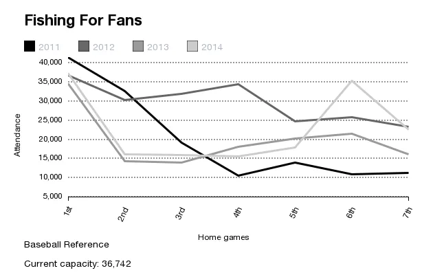 七场比赛是一个小样本,但图表显示了该特许经营权的近期历史。在2011年,新体育场建成之前,马林鱼队仍处于低迷状态。三年前,超过40,000人参加了主场揭幕战,但到第四场比赛时,出席人数略微下降到超过10,000人。然后是充满大承诺的一年,一个新的球场,以及一份充满大牌球员的新名单来填补它——而2012年开幕日的兴奋感在早期赛季中保持相对强劲。但球队表现不佳,洛里将他昂贵的天才球员送走。到2013年,令人惊讶的是,球迷们仍然可以依赖于拥挤的主场首秀,之后出席人数骤降并保持低迷。