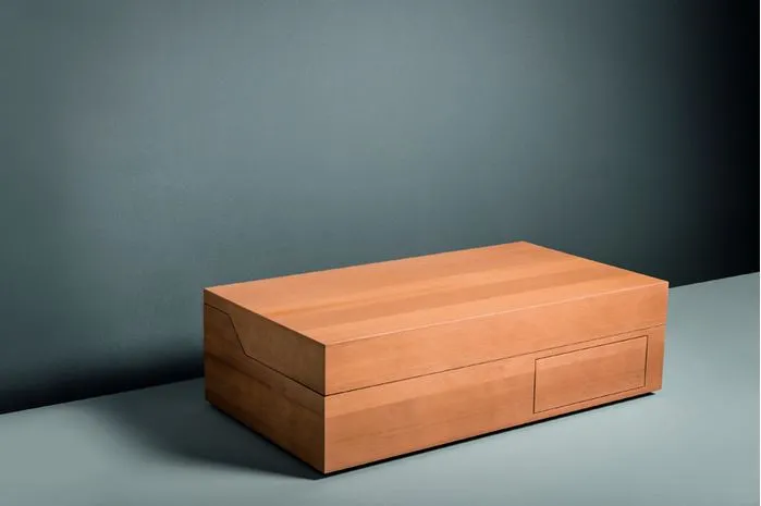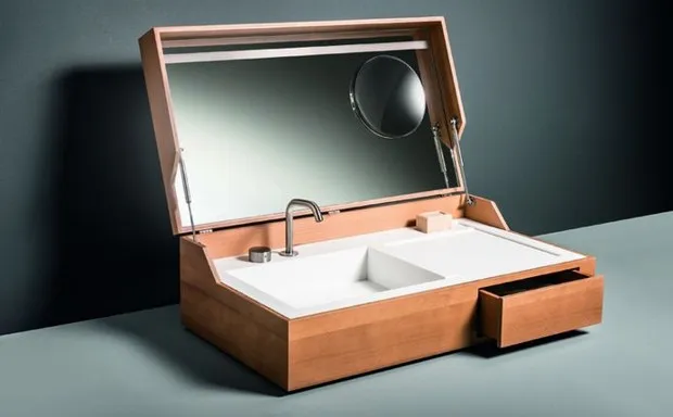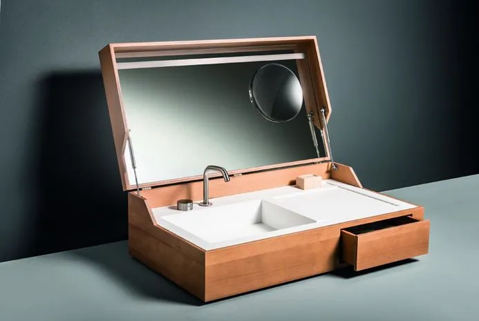 由功能组件组成,Corian洗手盆配备了集成的不锈钢水龙头、带放大镜的镜子、降低的架子、物品存放抽屉、灯和插头。当关闭时,“隐藏”变成一个无缝的箱子,可以从一个地方运输到另一个地方。结构和抽屉经过热处理,采用木材冷杉饰面,并配备了由不锈钢机制支持的电气设备,以便于开关。