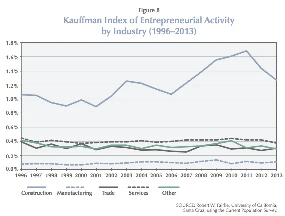 这一趋势已经显而易见多年。在建筑行业中,你可以清楚地看到这一点,新房建设的波动似乎使建筑工人变成了小企业主,然后又变回了员工。