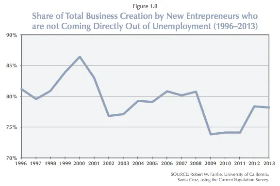 考夫曼在今年的报告中强调了新创业者动机的变化。直接从失业状态中创业的人所占的比例自经济衰退以来有所下降。