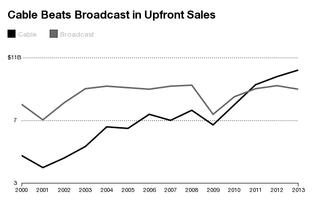 尽管观众从广播转向有线电视的趋势明显,但这两个领域筹集的总金额仍大致相等。有线电视最近才开始领先: