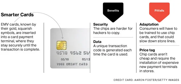 许多公司在更新其系统以符合一种称为EMV(即Europay-MasterCard-Visa,最初支持该技术的公司)的基于芯片的智能卡标准方面落后于计划。信用卡网络已设定2015年10月的截止日期,要求大多数美国商家升级其支付系统。EMV被认为更安全,因为从芯片中复制账户号码和安全代码比从美国大多数卡片上的磁条更难。EMV卡为每笔交易生成一个唯一代码,使其比条形卡更难被黑客攻击或伪造。
