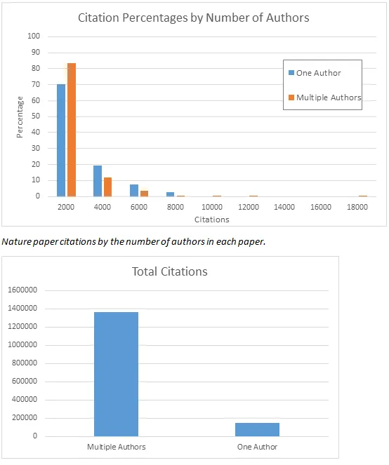 数据告诉我们什么?我从2001年到2010年挖掘了《自然》期刊中被引用最多的1000篇文章,以说明单作者研究的相对贡献。如果你对快速发展的学术出版世界不太熟悉,论文所获得的引用数量大致表明了其影响力。